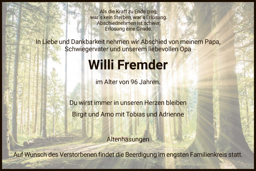 Hier finden Sie alle Traueranzeigen aus der Zeitung, die bisher für Willi Fremder erschienen sind. Weitere Traueranzeigen, die in der Zeitung erscheinen, werden hier ebenfalls aufgelistet