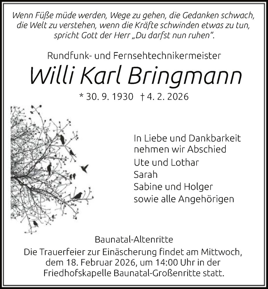 Hier finden Sie alle Traueranzeigen aus der Zeitung, die bisher für Willi Karl Bringmann erschienen sind. Weitere Traueranzeigen, die in der Zeitung erscheinen, werden hier ebenfalls aufgelistet