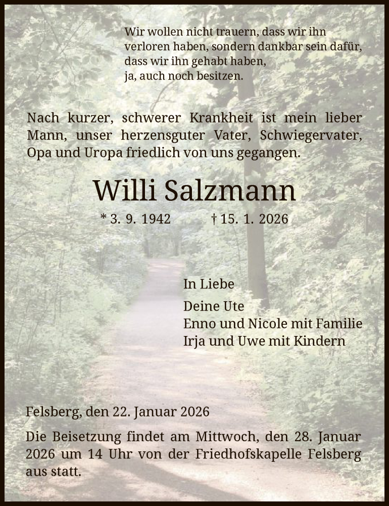 Hier finden Sie alle Traueranzeigen aus der Zeitung, die bisher für Willi Salzmann erschienen sind. Weitere Traueranzeigen, die in der Zeitung erscheinen, werden hier ebenfalls aufgelistet