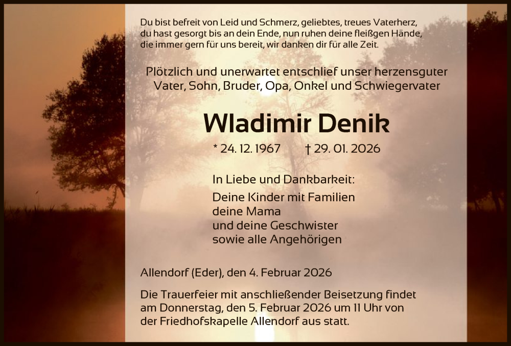 Hier finden Sie alle Traueranzeigen aus der Zeitung, die bisher für Wladimir Denik erschienen sind. Weitere Traueranzeigen, die in der Zeitung erscheinen, werden hier ebenfalls aufgelistet