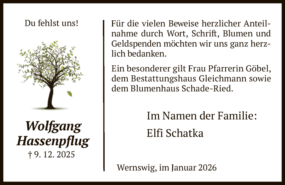 Hier finden Sie alle Traueranzeigen aus der Zeitung, die bisher für Wolfgang Hassenpflug erschienen sind. Weitere Traueranzeigen, die in der Zeitung erscheinen, werden hier ebenfalls aufgelistet