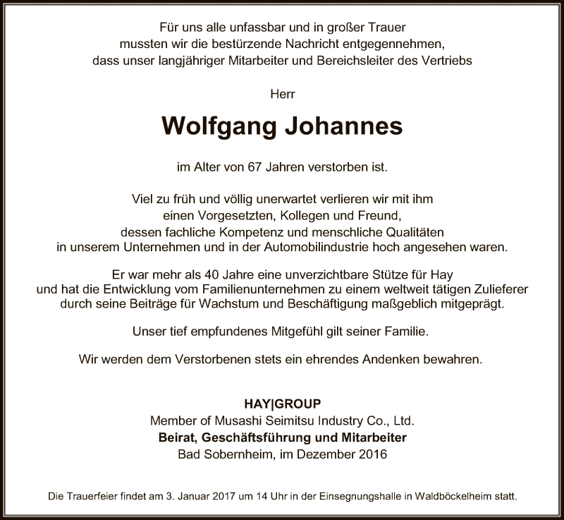 Hier finden Sie alle Traueranzeigen aus der Zeitung, die bisher für Wolfgang Johannes erschienen sind. Weitere Traueranzeigen, die in der Zeitung erscheinen, werden hier ebenfalls aufgelistet