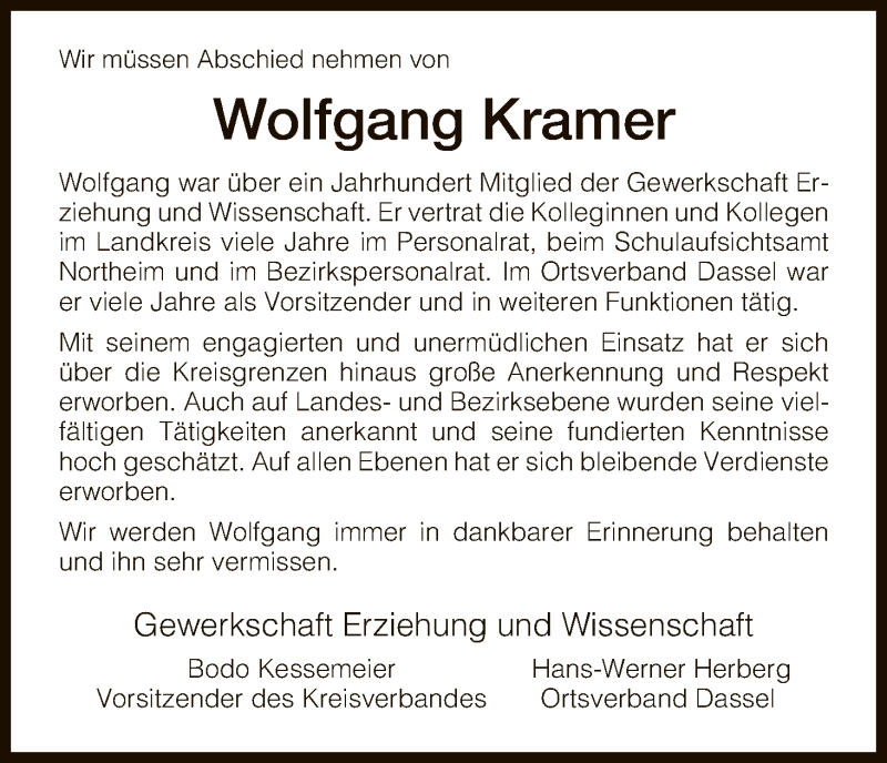 Hier finden Sie alle Traueranzeigen aus der Zeitung, die bisher für Wolfgang Kramer erschienen sind. Weitere Traueranzeigen, die in der Zeitung erscheinen, werden hier ebenfalls aufgelistet