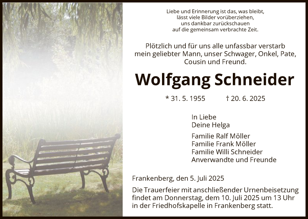 Hier finden Sie alle Traueranzeigen aus der Zeitung, die bisher für Wolfgang Schneider erschienen sind. Weitere Traueranzeigen, die in der Zeitung erscheinen, werden hier ebenfalls aufgelistet