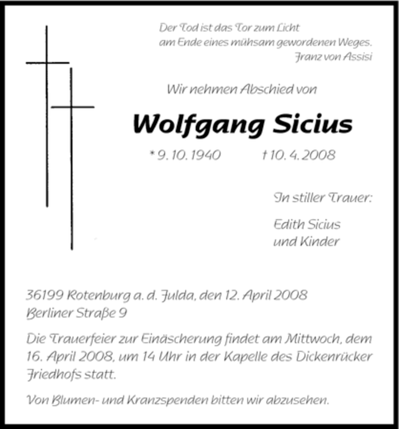 Hier finden Sie alle Traueranzeigen aus der Zeitung, die bisher für Wolfgang Sicius erschienen sind. Weitere Traueranzeigen, die in der Zeitung erscheinen, werden hier ebenfalls aufgelistet