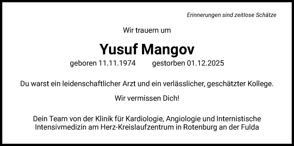 Hier finden Sie alle Traueranzeigen aus der Zeitung, die bisher für Yusuf Mangov erschienen sind. Weitere Traueranzeigen, die in der Zeitung erscheinen, werden hier ebenfalls aufgelistet